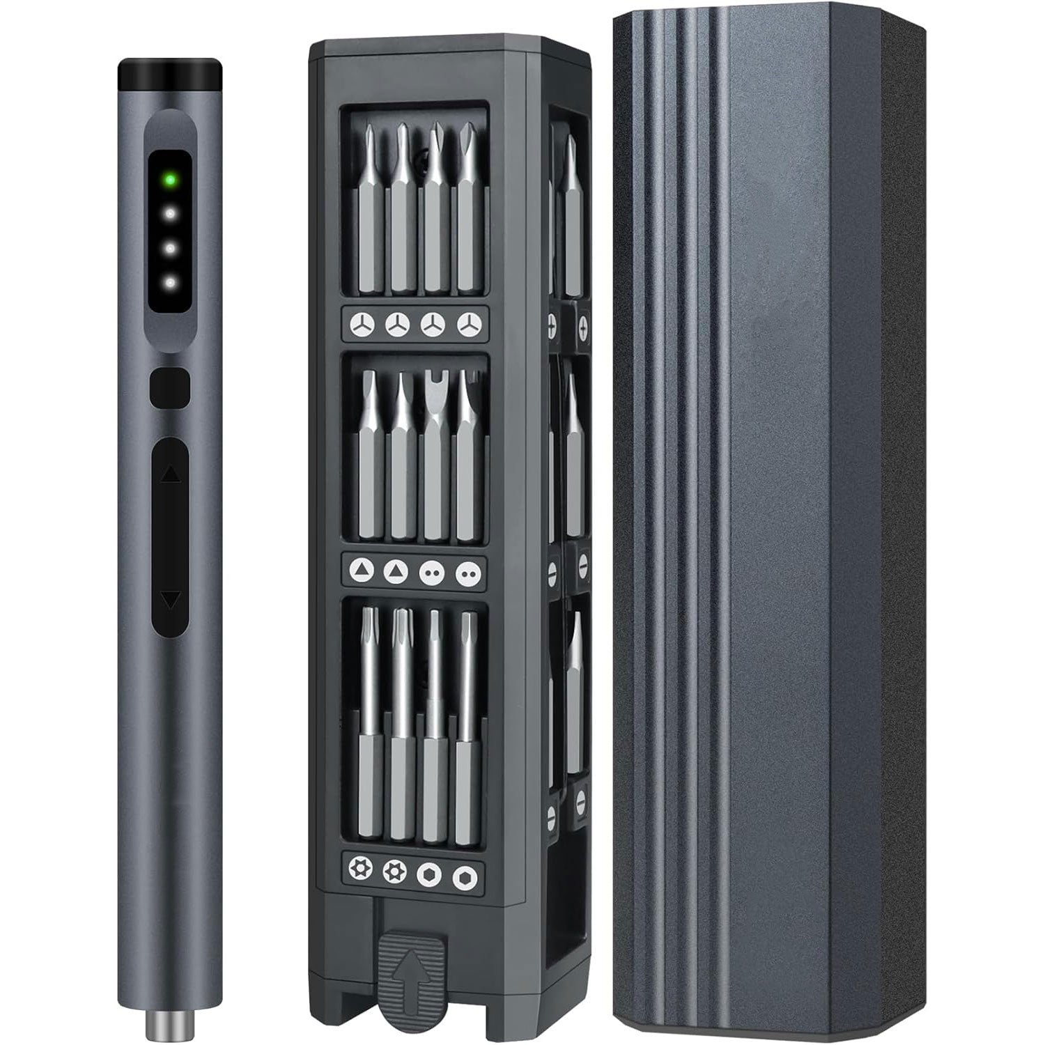 The package includes: the electric screwdriver, 50 S2-steel bits, USB-C charging cable, deluxe carry case with organized bit storage, and quick-start guide. Everything you need to tackle any project out of the box.