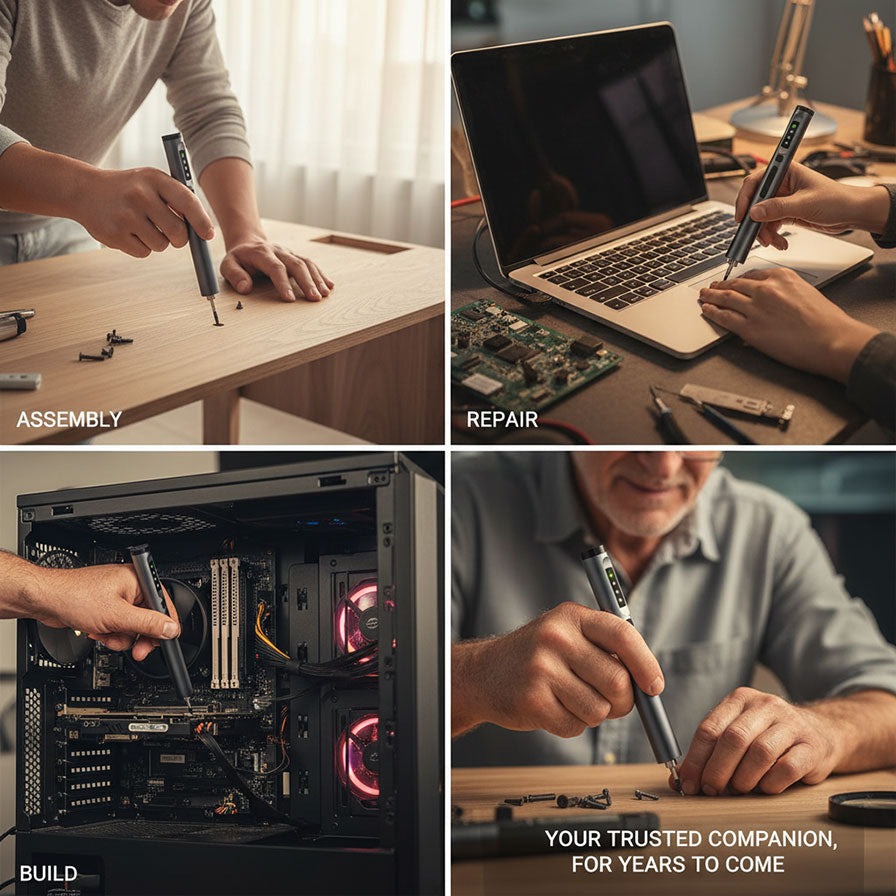 This screwdriver is perfect for furniture assembly (IKEA, wooden pieces), electronics repair (laptops, phones, tablets), PC building, drone repair, watch battery replacement, camera assembly, home repairs, and general DIY projects. Anywhere you need precision and speed without damaging materials.